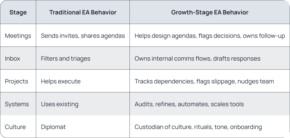 A growth-stage EA often becomes a cultural anchor: onboarding, rituals, internal consistency, messaging standards. They help your culture scale with you.
